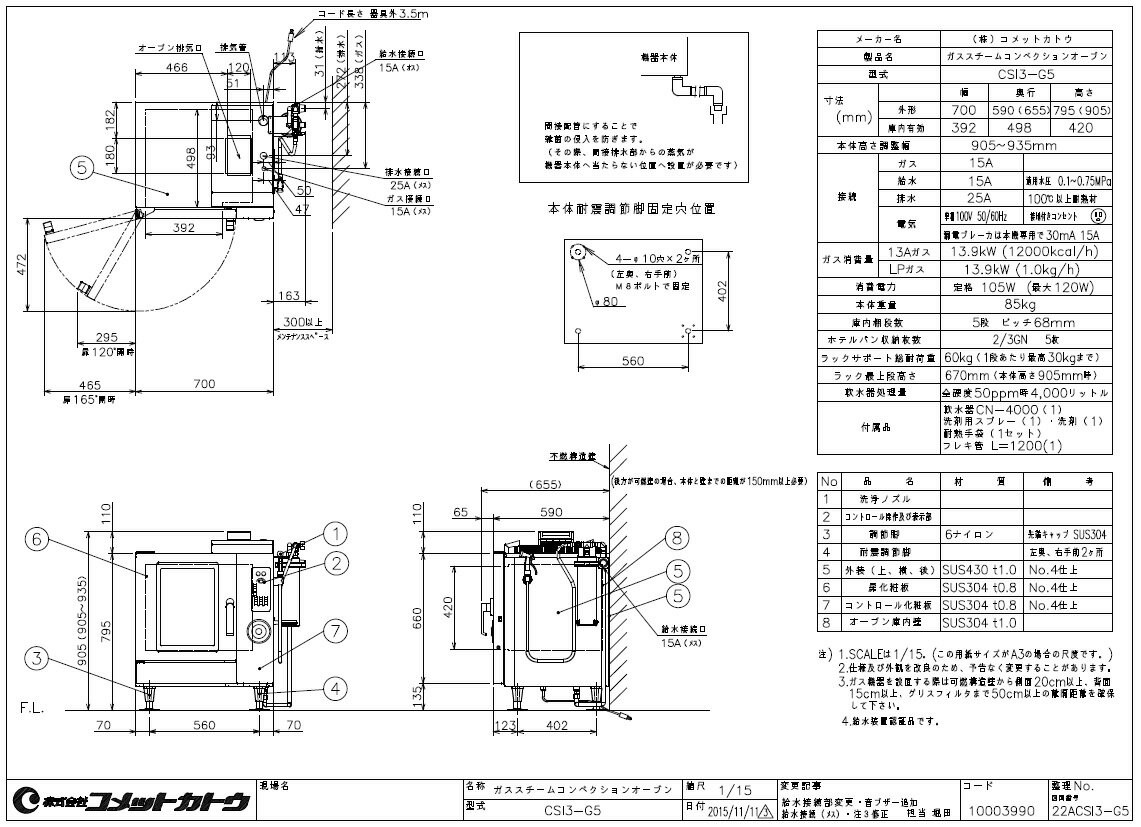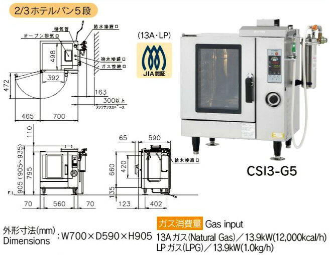 商品の仕様●外形寸法(mm):W700×D590×H905●ガス消費量:13Aガス13.9kW(12000kcal/h) LPガス13.9kW(1.0kg/h)●電気消費量:100V/105W●ガス接続口径:15A●給水接続口径:15A●排水口径:25A●製品重量:85kg●水圧0.1Mpa〜0.75Mpaでご使用ください。